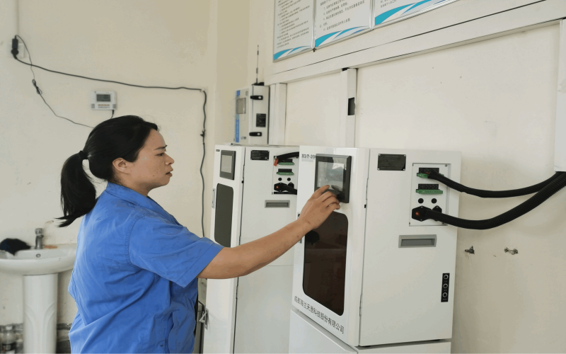 為了確保各個環(huán)節(jié)污水檢測指標正常,李紅每隔2小時就對進出口在線監(jiān)測室的在線設備、各類藥劑進行巡視,查看數(shù)據(jù)是否上傳成功,及時處理應急突發(fā)問題。水廠占地達130畝,一遍巡視下來就會花上1小時左右。當進口取樣管堵塞時,她帶領(lǐng)班組成員積極協(xié)助維修科等工作人員對取樣設備進行清理。為了減少進口監(jiān)測設備吸到雜質(zhì)堵塞檢測設備的管路,她每隔1-2小時還要對進水取樣口篩網(wǎng)進行沖洗,從來不怕臟、不怕累。