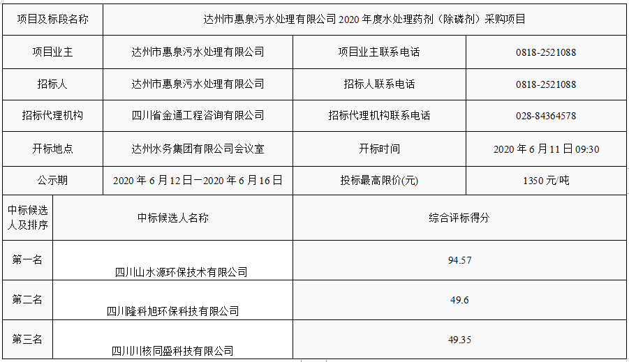 下一篇:達(dá)州市惠泉污水處理有限公司2020年度單過(guò)硫酸氫鉀復(fù)合粉采購(gòu)項(xiàng)目招標(biāo)公告
